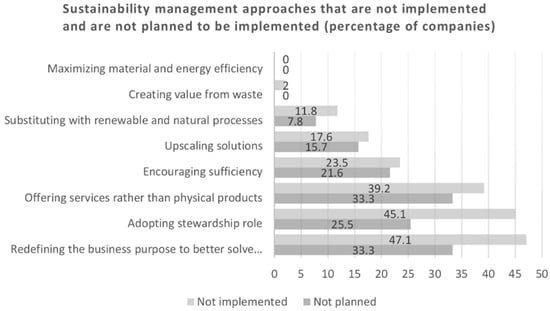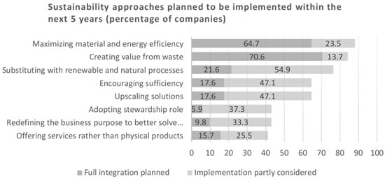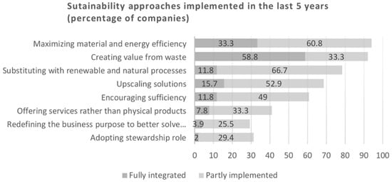The archetypes were applied empirically by Ritala et al. [32], who explored the shift to more sustainable business models by analyzing press releases from S&P 500 companies over period of nine years. The codes in press releases show evidence for ‘substitution with renewables and natural processes’ (28.53%), ‘maximizing material and energy efficiency’ (27.42%) and ‘creating value from waste’ (22.11%) most frequently. There is little support for archetypes ‘deliver functionality rather than ownership’, ‘encourage sufficiency’ and ‘develop scale up solutions’ [32]. It was expected that Austrian companies would have similar preferences for sustainability management approaches.