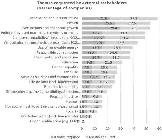 The largest German companies strongly engage with the themes of (further) education, energy consumption, occupational safety, employment and emissions, waste and wastewater. These themes, plus that of ‘diversity’, represent the six themes that are the most frequently requested by their external stakeholders [21]. The importance of themes related to social aspects and personnel has increased recently, in both company engagement and stakeholder requests for, e.g., diversity and equality [21].