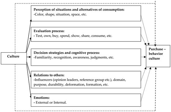 Consumer culture influences differences in choices, purchases, and product usage [41]. Figure 1 explains the effect of culture on consumer choices, which ultimately determines purchase behavior. National wealth can have prominent differences in income levels and has emerged as an explanatory variable for buying decisions [13]. When investigating consumer decisions and reactions, a few other variables are rooted in order, including sociology, economics, and ecology, resulting in additional behavioral reactions by an individual [37]. Culture largely motivates people and affects their behavior: the different purchases people make are affected by whether their decisions are based on group or individual decisions, and their choices and emotions affect market choices [16]. Likewise, many researchers have presented other aspects of cultural influence on different facets of CB in different scenarios [37,42,43].