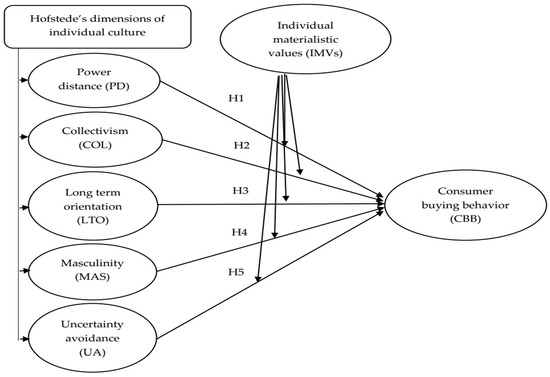 CBB is influenced by external factors including CVs, economic forces, and personal forces, such as IMVs [7]. Changing CVs are determined by IMVs, which indicate the acceptance of any external change in behavior [47]. In the decision-making process, CB is powerfully linked with one’s culture and materialism [10,47]. People tend to respond to the globalization effect according to materialistic thoughts. For example, buying behavior changes when people acquire happiness, success, and centrality [7,10,50]. In terms of the cultural impact on CB, many studies have been carried out, but most analyzed the effect of either national culture [30,34,37] or performed a cross-cultural comparison between two or more countries [12,30,34,37]. Few studies [7,10,47] addressed the impact of culture (at an individual level) and materialism on CBB toward foreign brands within a proxy of globalization and market sustainability.