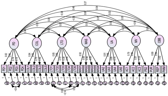 SEM explains the relationship between two or more latent variables and the complex relationship between unobserved and observed variables [61]. Second-order CB-SEM with the bootstrapping method was used to measure the significance of the path model. Small multivariate issues are resolved with bootstrapping with standardized z-score values of constructs (Table A3). The model in Figure 4 illustrates the path model of the dependent variables, including PD, UA, LTO, MAS, and COL, to measure the impact on CBB with an interaction of MVs. Table 10 shows the overall fitness of the model by using model fit indices. The value of CMIN/DF is 1.735, which shows the model fitness [64]. The values of GFI and AGFI were 0.911 and 0.889, respectively, which show the good model fitness because all the values were closer to 0.9 [61]. The value of RMSEA was 0.048, which is closer to 0.05, indicating good model fit.