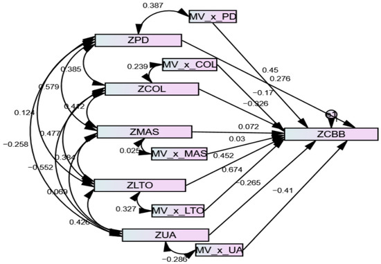 The value of COL also has a significant negative impact on CBB with a β-value of −0.326 [34]. However, MVs do not have a significant impact on the relationship between COL and CBB as a moderator. This shows that people prefer to make decisions independently rather relying on group decisions. The value of MAS does not show any significant impact on CBB with a β-value of 0.072 [31]. Similarly, the MVs value does not show a significant impact as a moderator on the relationship [10]. Standard estimate values show that LTO has a strong significant impact on CBB with a β-value 0.452 [32]. And the moderating effect of MVs also show a strong significant impact on the relationship between LTO and CBB with a β-value of 0.674. UA has a significant negative impact on CBB with a β-value of −0.265 [18], and MVs have a significant negative impact on the relationship with a β-value of −0.410.