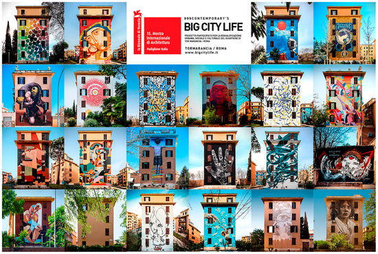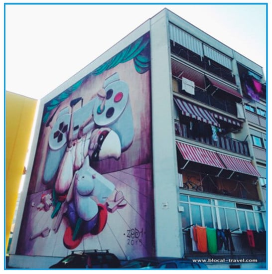 In addition, in the metropolitan city of Rome Street Art is widespread, and since 2015 a map with a tour including 13 of the 15 districts of the Italian capital has been available. In particular, the peripheral neighborhoods of Rome have found a new touristic vocation with this form of art (Figure 2). One of the most meaningful examples is the Tor Marancia neighborhood, where the cultural association 999 Contemporary promoted the Big City Life project with the realization of 21 murals (each of 14 square meter) on façades of the City Hall. The overall cost of this project was about 168,000,00 euro, financed for the 56% by 999 Contemporary association, 26% by Roma Museo Foundation and 18% by Roma Capitale Public Authority [].