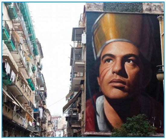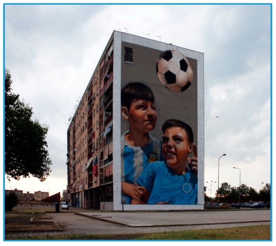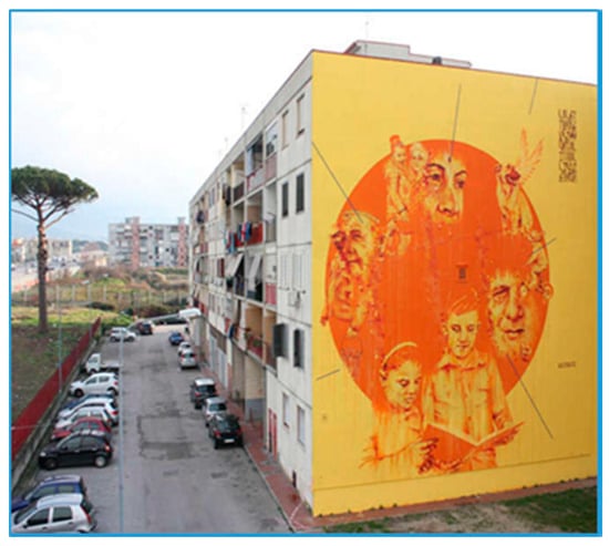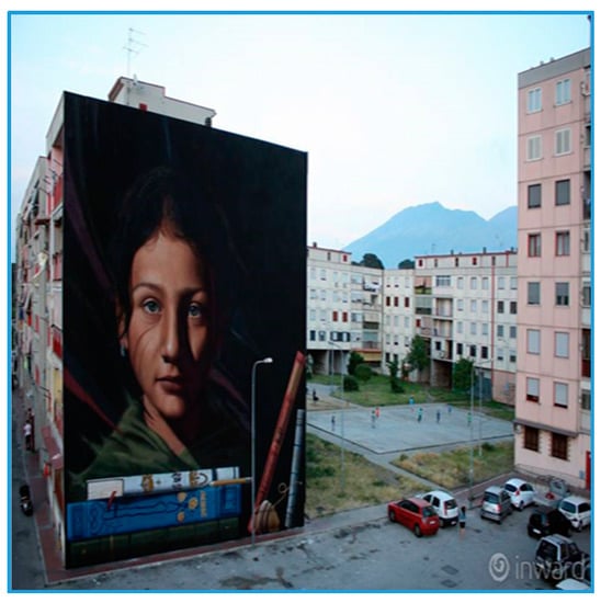 With specific reference to the context of Naples, in the Campania region (Italy), in accordance with Camorrino: “…certain distinctive works—which refer specifically to Street Art productions—are strong indicators of incipient changes ongoing in the city: the dynamics of re-signification that such practices and cultural products have established to cause episodes of urban regeneration” []. Widely recognized, urban regeneration is a key factor for the urban sustainability and, from this perspective, what it is currently happening in some contexts of Naples allows us to sustain this assumption (Ponticelli, Scampia, S.Giovanni a Teduccio, etc.). There, as in other Italian peripheral areas (Tourin, Rome, Milan, etc.) the regeneration processes, have frequently found efficacious ‘activators’ in spontaneous phenomena as Street Art practices rather than being governed by the public administration. Several cases have demonstrated in an empirical way how this form of urban art can activate artistic requalification and social regeneration and play a meaningful role in the ‘creative placemaking’ [].
