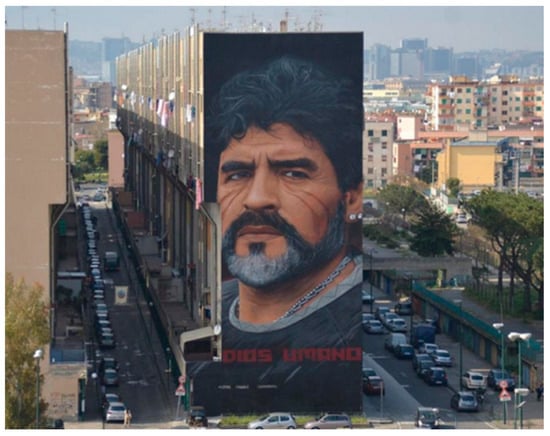 Further interventions of street art have been carried out in San Giovanni a Teduccio, another neighborhood on the outskirt of Naples, where Jorit Agoch has realized Dios Umano dedicated to the famous football player Maradona (Figure 8) thanks to the patronage of the municipality of Naples. Even in the historical center of Naples there are Street Artworks, some of which have also led to micro activities of merchandising. As example, in the Forcella district, in 2015 the artist Jorit realized the iconic mural of San Gennaro Operaio (Figure 9), an official print production of the work was implemented under the supervision of the author, together with other gadgets which are appreciated by tourists. Several new touristic services opened up here (such as restaurants and bars).
