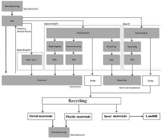 The electronics market is also unusual in that it features the constant launch of products with new technologies and functionalities, thereby shortening the useful life of a given product and creating a market for second-hand goods, with functional equipment, that are sold for reuse [20]. The greater consumption of electronic appliances and the shortening of their useful life have accelerated product obsolescence. Millions of tons of products are discarded every year, but a large proportion of them are reusable [21].