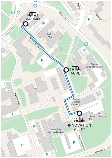The route of the driverless shuttle bus in Otaniemi area, Espoo, Finland.