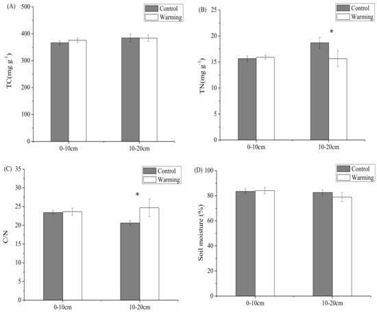 SOC is used as substrate for microbial respiration and is therefore vital to the process [42]. We found that soil MBC and DOC decreased under three years of warming in the boreal peatland. The decrease of DOC was consistent with a previous report that soil warming stimulated DOC decomposition in the Zoige peatland [43]. We previously found that increasing temperature significantly hastens the cumulative CO2 emission from the decomposition of peat soil MBC and DOC by an incubation experiment [44]. Rinnan et al. [45] and Hou et al. [46] also found that soil warming negatively affects the soil MBC. One possible explanation for this result is that the cell reserves and labile substrates for microbes are depleted under warming [46]. The results of our study indicated that warming exerted no evident effect on soil TC, which is consistent with the results of Chen et al. [47]. They found that 5 and 15 years of warming did not affect the SOC pool because of high soil carbon levels. Although warming influences MBC and DOC, the proportions of these labile organic carbon (LOC) in the total SOC pool are low; thus, the variation in labile carbon is insufficient to influence the total carbon storage [47]. In addition, warming could decrease microbial decomposing capacity to recalcitrant carbon, and then ameliorate soil carbon loss [48].