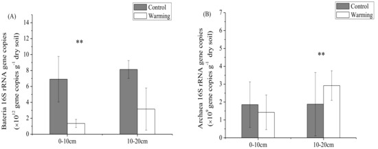 Total soil bacteria (A), archaea (B), mcrA gene (C), and pmoA gene (D) abundances in 0–10 cm and 10–20 cm layers received warming treatment from 2014 to 2016. Error bars represent the standard error of the means (n = 4). Significant differences between the control and warming treatment are indicated by * p < 0.05, ** p < 0.01.