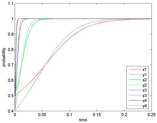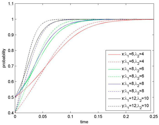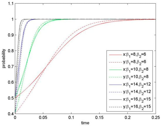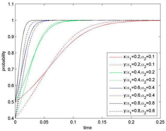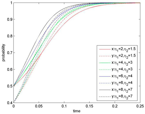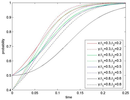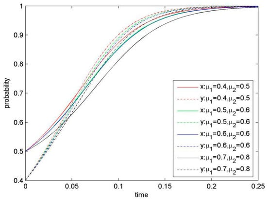 For in Equation (5), it is determined by the initial probability of Firm 1 and Firm 2. Two situations of are discussed as follows.