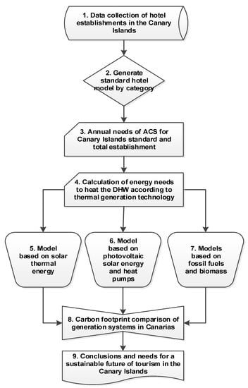 We have studied the DHW needs of the hotel establishments and the CO2 emissions associated with the production of the DHW. Specifically, we followed the workflow shown in Figure 1, which is summarized as follows: