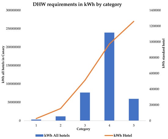 Energy requirements for the domestic hot water (DHW) for each standard hotel and for the entire group of hotels in the Canary Islands by category.