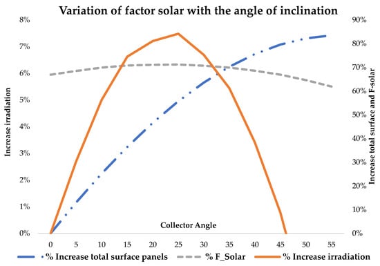In order to optimize the space and maximize the irradiation with the minimum collector surface, the angle of inclination of the panels is set at 15°. Experimental results for the different inclination values, necessary installation surface and irradiation difference are given in Figure 3 obtained for the sum of all hotels the Canary Islands. The chosen angle of inclination of 15° provides a moderate use surface, since the highest values close to the ideal of 25° imply that the main surface increases by 15% and the annual useful irradiation only increases by 0.8%. In addition, this chosen angle helps the evacuation of water and dust, mainly due to the dust of the Sahara or Calima [53,54], which reaches the Canary Islands.