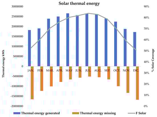 Then, we can obtain the needs for all hotels in the Canary Islands. The annual average values of coverage of 70.3% of annual thermal needs are obtained through thermal solar panels. Figure 4 shows the energy values generated by the thermal solar panels, missing energy that must be covered by the current boilers and the solar fraction obtained monthly, for all the hotels in the Canary Islands. As previously mentioned, the missing energy is supplied by the current LPG propane or diesel boilers.