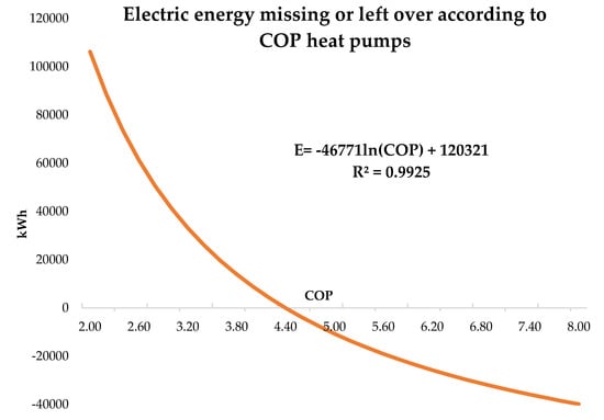 Then, we calculate the water heating system for DHW based on heat pump by using monthly and annual generation data. For this purpose, different heat pump efficiencies with COP values are used. We start with a minimum value of 2 for older equipment up to a maximum of 8 for more modern equipment. Modern equipment has optimum operating conditions and high-efficiency dissipation systems by aerothermal, geothermal or hydrothermal. Figure 5 shows the results for the total energy requirements for hotels in the Canary Islands. It is observed that systems with a COP equal to 4.4 produce zero emissions and equipment with a higher COP consume less energy than that generated by photovoltaic systems. The energy left over could be used for self-consumption producing a general decrease in emissions from hotel establishments. It is also verified that the characteristic function that describes the curve of necessary or excess energy of the heat pumps concerning the efficiency of the machines corresponds to a logarithmic function, which has a very high correlation index for all its values.