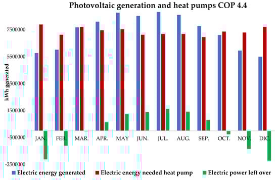 We calculate the consumption of heat pumps for all hotels in the Canary Islands. To this end, we check whether the photovoltaic solar panels help to supply the energy necessary to cover the needs of the DHW, except from October to February, which require an external supply. However, the annual demand for electricity is covered by the total amount of energy generated in the remaining months from March to September. Figure 6 shows the photovoltaic generation obtained and the surplus or lack of electrical energy to cover the needs of heat pumps with an average COP of 4.4, monthly.