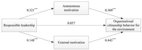 Because the direct effect of responsible leadership on OCBE was no longer significant (β = 0.0057, p > 0.05), intrinsic motivation and extrinsic motivation completely mediated the relationship between responsible leadership and OCBE, whereby the mediating effect accounted for 70% of the total effect.