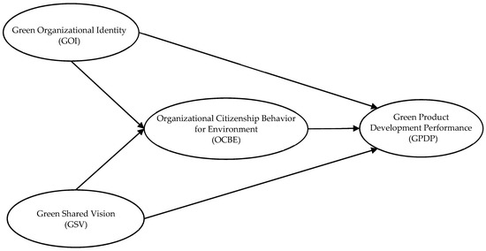 Erkut and Kaya [24] indicated that innovativeness of corporate social responsibility activities for spreading awareness depends on the establishment of a firm and the type of corporate culture and character it implements. Such innovativeness requires knowledge on current and potential employees to create and maintain a competitive advantage. Therefore, companies must integrate the corporate and employees to use innovative knowledge for gaining competitive advantage. Based on the aforementioned observation, this study explored the green shared vision (GSV) of the company, green organization identity, and green organization citizenship behavior oriented by employees. Employee behavior is crucial among several elements contributing to the success of GPD. However, this behavior may not be cultivated by formal reward or performance assessment systems [25]; therefore, the behavior of staff members in the company is frequently considered a primary factor for the success of green organization development [25,26,27,28,29,30]. Voluntary actions by the staff members of the company to improve the green management–related measures are essential, which is termed green organizational citizenship behavior, and this behavior is not formally included in organizational system rewards [25,31,32]. Therefore, green organizational citizenship behavior is an approach through which a company achieves environmental management or plans GPD and production.
