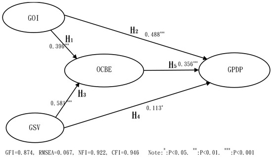 The hypotheses were tested using structural equation modeling and analysis of moment structure. Table 5 summarized the results, which present the acceptable fit of the full model (GFI = 0.874, RMSEA = 0.067, NFI = 0.922, and CFI = 0.946). Figure 2 presents the results of the complete model. All five paths have significantly positive estimations, indicating that H1, H2, H3, H4, and H5 were validated in this study. An increase in the GOI and GSV can improve OCBE and GPDP. The GOI and GSV are crucial drivers of GPDP. Furthermore, the study validated that the positive relations among GPDP, GOI and GSV are partially mediated by OCBE. This validation indicates that the direct and positive effects of GOI and GSV on GPDP. In addition, the indirect and positive influence of OCBE on GPDP. The mediation effect test of Baron and Kenny [87] indicated that the OCBE mediates the relations between GOI, GSV, and GPDP. In this framework, antecedents are the GOI, GSV and reactive feedback. GPDP provides the results, and the mediator is OCBE (Figure 2). Therefore, organizations must improve their GOI, GSV, and OCBE for improving their GDPD.