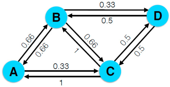 If relational data are prepared in the form of a matrix as in Table 2, those would be conveniently converted into a network. Figure 1 shows an example of a weighted graph and its relationships (links) between nodes (actors) have unique values based on Table 2. The weights in a weighted graph can be depicted by the thickness of a link. SNA can be used to analyze relational data, such as kinship patterns, community structure, interlocking directorships and so forth [28], and the relationship can be expressed as any numerical value (i.e., a weight) by placing the values having an unique meaning on the strength of relations, such as the degree of closeness among friends. From this point of view, in this paper, the Confidence from ARM can be allotted to the links between actors in a network and, by this, the level of causality (i.e., Lift) between causes can be calculated. For example, Figure 1 illustrates how each causes differ in influence on the probability of each other. The probability of B will be changed to 100% when C appears. By contrast, that will be 50% when D appears (see Table 2 and Figure 1).