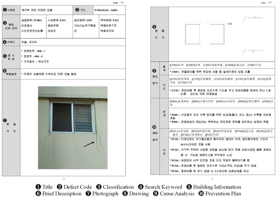 Figure 2 is an example of defect reports reported by one of the biggest general contractors in Korea. As mentioned above, the authors collected the defect reports from several contractors in Korea and there were using different format in their defect reports. Thus, the authors compiled the different defect reports and developed the database by incorporating only the common data type such as classification, brief description, and defect causes.