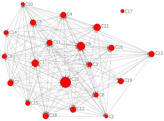 The benefits of using SNA lie in the visualization of the complex interrelationships among the causes of defects. A social network analysis (SNA) diagram in Figure 3 illustrate the causality of defects in finishing work with the degree of centrality of each node (i.e., defect cause) depicted by the size of each node. As shown in Figure 3 and Table 7, Inadequate Protection (C20, centrality = 2.407) is the most influential cause of most concern, and is represented by the largest red circle in the social network analysis diagram. Also, Lack of Specification (C9, centrality = 2.015) and Interference by Other Tasks (C21, centrality = 1.920) were identified as the second and the third most influential causes, respectively. This means that most of defects in finishing work take place not due to quality or the technical problem of a given job task but due to inadequate protection (C20) ‘after’ successful completion of a job task; lack of specification (C9) ‘before’ execution of a job task; and interference by other concurrent job tasks (C21) ‘during’ execution of the job task. This result suggests that if a defect takes place in a job task in finishing work (e.g., plastering), its generation is more related with the construction environment and the construction managers responsible to provide a safe and productive construction environment, rather than with the job task itself and labors working on the job task.