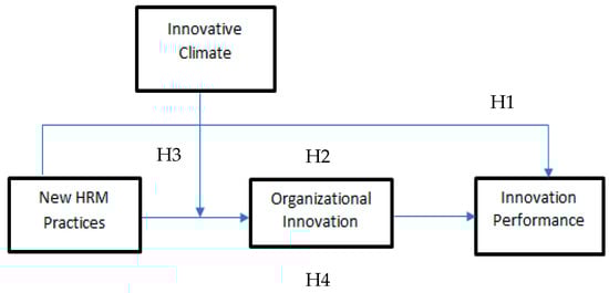 Earlier literature discussed that scholars should pay attention to the boundary conditions connected with NHRM practices [87,88] and specifically considered towards semi-government organizations [89]. To address the moderating effects, the innovative climate was introduced between NHRM practices and organizational innovation. As a vibrant process in an organization, the innovative climate works in a creative environment where employees’ energetic work behaviors suit the work condition [89]. Previously, organizational climate as a potential moderator received the attention of researchers [90,91]. After that researcher consideration has shifted into global organizational climate effects. However, some scholars have been concerned with a particular climate, mainly “innovation” [40,91]. The innovative climate exists in the organization and can facilitate the NHRM practices on organizational innovation. The innovative climate reflects rules and regulations that support creative ideas, a new expression of learning, and adopts a change in organizational context [92,93]. The innovative climate also empowers employees to think by themselves, regenerate new working terminologies, and reshape their cognitive, motivational, emotional, and intellectual resources through creative manners, and contribute to innovation performance. NHRM encourages employees to perform their best work, and the innovative climate provides resources in which NHRM practices and organizational innovation can work innovatively [63].