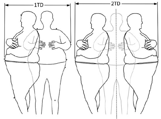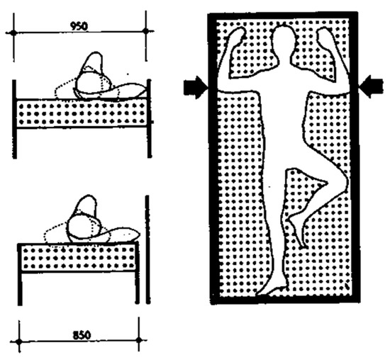 From the viewpoint of a user with a high weight, there are very few scientific publications about appropriate furniture dimensions [47,48,49] including the dimensions for beds and the bed’s components [50]. Some are based only on the weight of users. The use of wider beds is recommended in case of patients weighing more than 159 kg [51]. Other authors [52] suggest the use of special beds for users who weigh more than 147 kg or with a BMI score higher than 55 kg/m2. A scientific study [6] determined how much space individuals occupy when turning from supine to side lying (Figure 1) as predicted by their anthropometric attributes (i.e., waist circumference). The relationship between anthropometric attributes and the space occupied when turning was then used to establish guidelines for selecting an appropriate hospital bed width based on the size of the users. The findings from this study suggest that, when lying in the centre of a 910 mm wide hospital bed, a patient with a BMI greater than 35 kg/m2 would have insufficient space to be turned in either direction without lateral repositioning. Furthermore, a patient with a BMI greater than 45 kg/m2 would have insufficient space to be turned at all, even if repositioned to one edge of the surface before being turned.