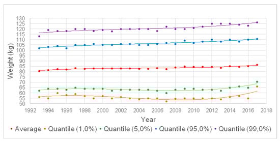 Development of the average body weight and percentiles for men in 1993–2017 [51].