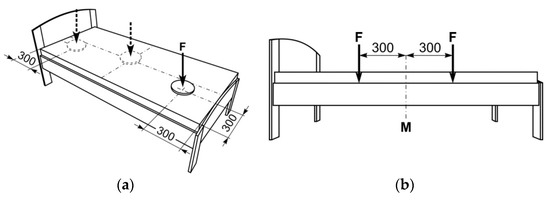 In general, bed tests are based on the weight of individuals of 110 kg. The following forces are used to describe the load. F = 1200 N (Figure 6b) is used for the vertical static load test of the edge and F = 1400 N is used for testing the strength of the lying area (Figure 6a). The stresses and deformation associated with a user weight of 150 kg are not defined in the standards. Therefore, the values corresponding to the weight of users of 150 kg were set using the linear extrapolation as follows: F = 1800 N (Figure 6b) for the vertical static load test of the edge and F = 2100 N for testing the strength of the lying area (Figure 6a).