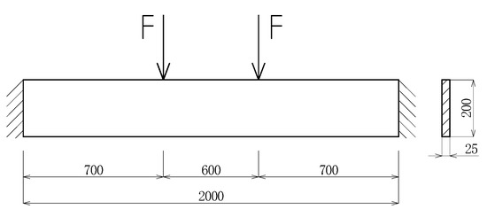 The vertical static load test of the edge was carried out in accordance with the static scheme shown in Figure 8 and the load was applied on the bed sideboard. The cross section of the bed sideboard of 25 mm × 200 mm with a length of 2000 mm was simulated as an orthogonally anisotropic material, that is, beech wood ρ = 684 kg·m−3, and the material constants are mentioned in Table 1. The direction along the grain is described by the x-axis and the radial direction perpendicular to the grain is described by y-axis. The tangential direction perpendicular to the grain is described by z-axis.