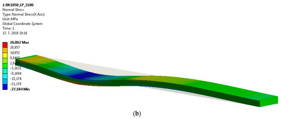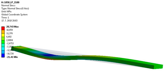 In some cases, not only safety but also material expenditures were taken into account. Therefore, a choice has to be made between the use of Norway spruce material recommended by the standard EN 1725:1998 or European beech. In the case of the Norway spruce wood, if the support beam of bed slats is 1500 mm and the applied load is 2100 N, a cross section of 95 mm × 24 mm has to be used; this means the cross-sectional area increases by 20%. The maximum compressive stress σc,0,d = 21.41 MPa and tensile stress σt,0,d = 20.743 MPa (Figure 10) corresponds to the design strength of spruce sawn timber [83] (Table 2).