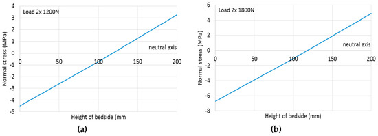 Development of normal stresses (y-axis) along the length of the cross section (x-axis) is shown in Figure 11. The bed sideboard with the standard cross section of 25 mm × 200 mm, made from the beech wood is suitable for use in terms of normal and increased stresses. The maximum values of normal and shear stress were not exceeded in the process of simulation. The design tensile strength of beech wood along the grain is ft,0,d = 35.53 MPa and the design compressive strength of beech wood along the grain is fc,0,d = 18.32 MPa. Calculated values show that the edge of bed described by the sideboard is fit for the load resulting from the excess weight of a user of 150 kg.
