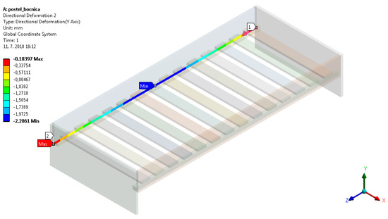 The bed sideboard is also fit for the use in terms of deformation. The maximum deformation with the increased load is ymax = 2.2061 mm. The deformation meets the condition that the bend of a beam is ymax < L/333 while L is the length of a beam. In our case, y = L/333 = 2000/333 = 6.006 mm, which means the condition ymax < y is met. The development of the deformation of the bed sideboard is illustrated in Figure 12.