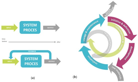 Systems thinking [16], synergy effects and closing cycles [15] involving the various life cycles in the area are important approaches to be able to apply the principles of circularity in area development processes. Since the 1950s, increasing interdependence in the world has led to new academic trends around complexity theories and systems thinking. It is recognised that new technologies alone will not solve our major sustainability issues. In systemic innovation, the social context changes simultaneously with the development of new knowledge and technology, and new ways of thinking, organising and acting arise in the context of the innovation [49]. Each system has a boundary and is characterised by a structure and a process, but also by the interaction between the system and the environment, the input and output. Systems thinking looks at both the bigger picture and the individual components [50]. In order to achieve synergistic effects, it is relevant to understand how components influence each other within the framework of the whole [12]. Involving the various life phases or life cycles and closing raw material chains are central strategies of the circular economy based on the principle of keeping a raw material in a cycle as long as possible, thereby limiting the loss of its value [5].