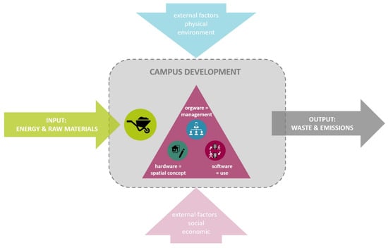 Research model with campus development as a system (own figure, based on various models from urban metabolism and area development).
