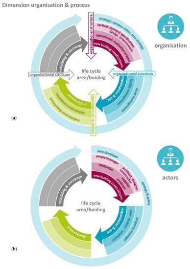 Dimension organisation & process: (a) Organisational structure and development processes: Campus organizations are usually hierarchically structured line organizations with different layers: The strategic level, which focuses on setting strategic goals and policies, the tactical level with the task of setting up processes and steering the realization of goals and the operational level, responsible for the execution of goals. (b) Actors: Within the organisation, different departments or sometimes external parties are involved in the different processes within the campus development for each life cycle phase.