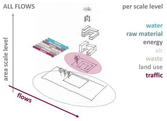 In the search for possibilities to make ever-growing cities more sustainable, in recent years, increasing attention has been paid to the concept of ‘urban metabolism’ [22,23]. The totality of urban flows such as energy, food or waste is considered as a metabolic process of the city organism [24]. Urban metabolism can be defined as “the sum total of technical and socio-economic processes occurring in cities” [22]. It not only relates to internal transformation processes within the urban system itself (the organism), but also to the balance of the inflow and outflow, the exchange with the environment. With a view to sustainable urban development, Tjallingii [25] formulated the Ecopolis strategy: The city is seen as a dynamic and complex ecosystem which consists of a number of smaller ecosystems on the one hand and is itself part of a larger ecosystem on the other hand. Plan development not only concerns the quality of a specific area, but also the inflow and outflow of the system and the quality of the environment outside those areas. Because the management of flows depends on the actors involved, but the flows also influence the design of areas and vice versa, these three areas of attention cannot be seen in isolation [24].