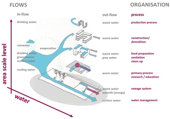 Area development manifests itself through spatial changes in different areas, which are mutually correlated and are part of a city or region [51]. Apart from housing a university organisation, a campus also has a physical side. The spatial dimension is characterised by different levels of scale, which cannot be seen separately from one another. The spatial scale levels are often related to different functions such as the campus as a whole being a carrier for transport and underground infrastructure. In his approach, Brand [58] distinguished six different layers of a building, with a different life cycle each time for the area, the outer structure, the shell, the installation, the interior space and the layout. The separation of the various layers concerns not only the physical and technical components, but also the functional and economic interests and responsibilities [59]. By relating flows on campus to levels of scale and presenting them in cohesion, insights are sought for how chains can be closed (Figure 4, Figure 5 and Figure 6). In some cases, local factors play an important role when it comes to closing cycles, while in other situations, optimisation can only be achieved on a larger scale [33].
