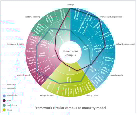 Framework for a circular campus as a maturity model with a fictitious example of two campuses. The framework cannot be seen as a blueprint. The starting point must be determined on the basis of a baseline measurement for the specific situation of a campus. Similar to a maturity model, the progress can be visualized in a coherent structure.