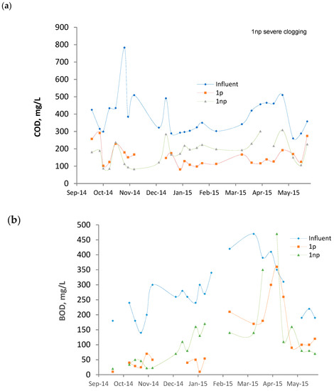 The fact that 1np became clogged in such a short time, after about two years in operation, was unexpected. Additionally, in the case of 1p, a negative trend in performance along time can be observed, particularly for BOD (Figure 3). To understand these results, the following must be considered: