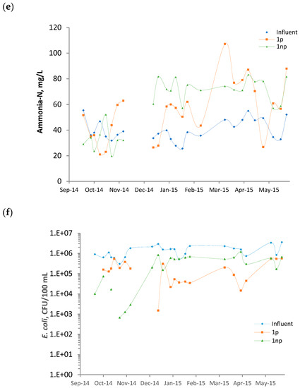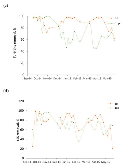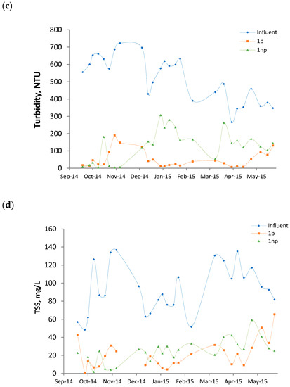 The evolution of parameters such as COD, BOD, turbidity, TSS, ammonia-N, E. coli, and TC are represented for the influent and the effluents of 1p and 1np (Figure 2). Missing points have been removed after the statistical analysis of outliers.