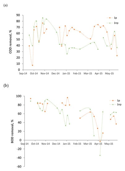The hydraulic loading rate (HLR) and organic loading rates (OLR) are represented in Table 2. The average BOD-LRs applied in the present study were 51 and 70 g/m2d, for 1np and 1p, respectively. These values fall in the upper range of those found in the literature. For instance, the OLR applied to the French System’s first stage ranged between 40 and 50 g BOD/m2d [5].