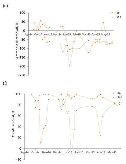 Although for some parameters, 1p received higher surface loadings, its performance was equal to or better than 1np (Table 3). The removals were slightly higher for 1p, although not significantly (p > 0.1) for COD (1p: 58%, 1np: 50%), BOD (1p: 62%, 1np: 59%), TSS (1p: 77%, 1np: 72%), E. coli (1p: 79%, 1np: 73%), and TC (1p: 82%, 1np: 74%). The exception was turbidity removal (1p: 90%, 1np: 73%, p: 0.005) for which the presence of plants improved clearly. This result is of interest, because according to Spanish legislation, turbidity is a basic parameter for the reuse of treated wastewater [35].