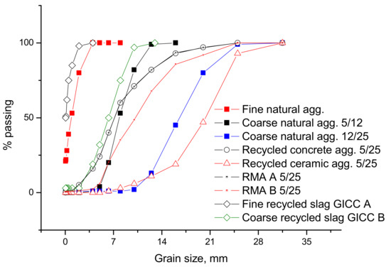 Grading curves of recycled and natural aggregates.