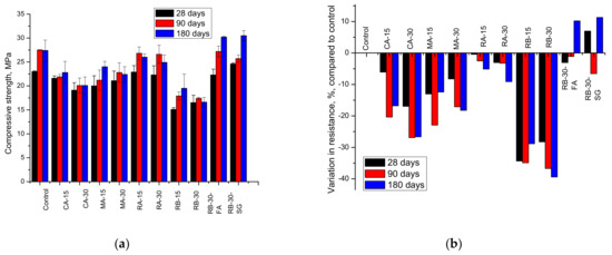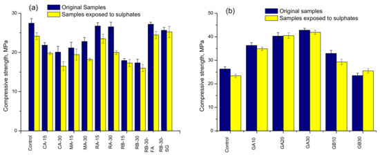 The results of the residual compressive strength after sulphate attack, simulated according to the standard ASTM C1012 [62], are shown in Figure 7.