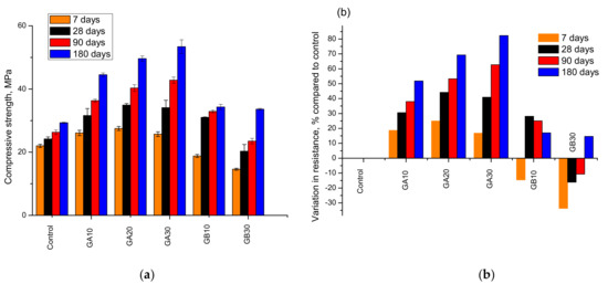 The compressive strength results of the concretes with both the coarse (GB) and fine (GA) fractions of the slag as recycled aggregates are shown in Figure 4a. The concretes with the fine fraction of slag show higher resistance than the control concrete. The fine fraction of the recycled aggregate usually gives divergent results and the presence of fine particles is generally pernicious for the resistance of concrete. In this study, the results are very positive for the compressive strength, and the effect of a high percentage of fines present in the recycled sand is very positive. The findings are in agreement with the effect produced by the slag as an addition in the case of using recycled mixed aggregate Type B and already reported in literature [28]. It is also in agreement with the results that said that the fineness of the aggregate was crucial for the obtained results [23]. The presence of the coarse fraction (GB) causes a slight decrease in the compressive strength when it is used to replace natural aggregate, especially for the substitution percentage of 30% at initial ages. Possibly due to the reactivity shown by the material, especially when particles are very fine, the resistance of the concrete increases, and after 180 days, and it becomes higher than the resistance of the reference concrete. This finding indicates that the slag obtained from the GICC thermal plants could be used as coarse aggregates in concrete elements. However, the fact that the resistance does not increase significantly for the case of using 10% recycled slag as coarse aggregate might mean that this beneficial effect is limited. More research is required to determine the optimum amount of slag, as well as the effects in the longer term. Based on the level where this research has reached, it is possible to say that this waste in the coarse fraction can also be used for replacing aggregates in concrete. It is true that, to the authors’ knowledge, there are no references regarding the use of GICC slag as aggregate; however, some efforts have been made on the use of the wastes generated in the incineration plant of MSW. The case of using MSW usually presents problems concerning metals, and when they are used as aggregates they can produce lixiviation of toxic substances, as is explained in a recent paper [49]. Most efforts are focused on the environmental safety of the possible use of the wastes. The case of the GICC slag used in this study does not present this issue, because no metal is included in the composition, and it would be possible to use them as aggregates with no problem. This finding has important implications from the point of view of the sustainability, because it allows the use of a waste, and shows that the waste can be used without wasting energy for grinding it. It facilitates the possibilities of using the waste, and makes the concrete production much more sustainable, without being forced to consume energy for the activation of the waste.