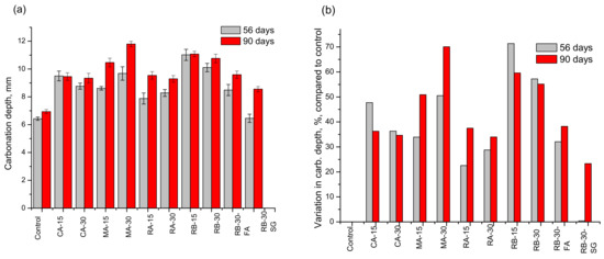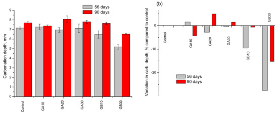 The results for the carbonation depth at 56 and 90 days, as well as its variation with respect the control samples, are shown in Figure 5 and Figure 6.
