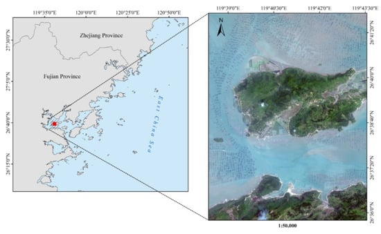 Map of Sandu Island at Ningde City, Fujian Province, China. The study area has an ideal geophysical environment for aquaculture. Here shows a Worldview-2 image of the study area in true color.