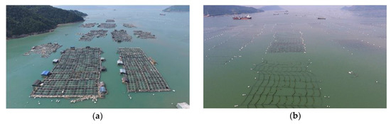Image examples of aquaculture areas on the ground: (a) Cage culture areas (CCA); (b) Raft culture areas (RCA).